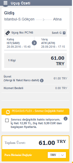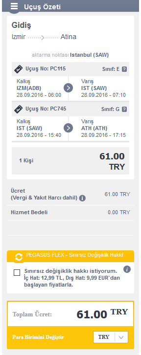 Eğer İzmir'den geliyorsanız yine İstanbul aktarmalı uçuşun fiyatı direk İstanbul'dan kalkan uçak ile aynı. Yine Pegasus'un sitesinden İzmir-Atina olarak seçin ve istediğiniz uçuşu alın.