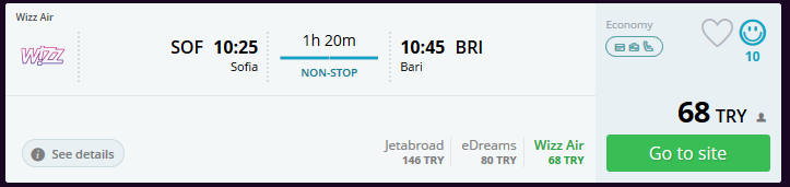 Sofya'dan İtalya'nın pek bilinmeyen ve göreceli olarak daha az turiste sahip olan şehri Bari'ye ulaşım yine uçakla. Bilet Fiyatı: 68 TL