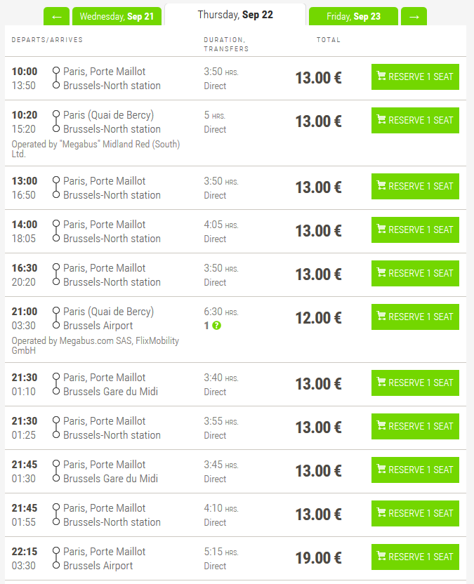 Aşağıda da Paris-Brüksel arasında otobüs bileti için bir örnek. Interrail bileti+20 Euro ile 1 saat 22 dakikada gidebiliyorsunuz, ya da interrail bileti ile 3 aktarmalı 4 saat 50 dakikada gidebiliyorsunuz. Ya da otobüs ile, 13-18 Euro arasında 3.5-4 saatte direk gidebiliyorsunuz. Bu kampanyasız, normal fiyat. Rotavrupa bu biletler ucuza satıldığında (3Euro, hatta bazen 1 Euro!) haber veriyor.