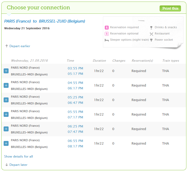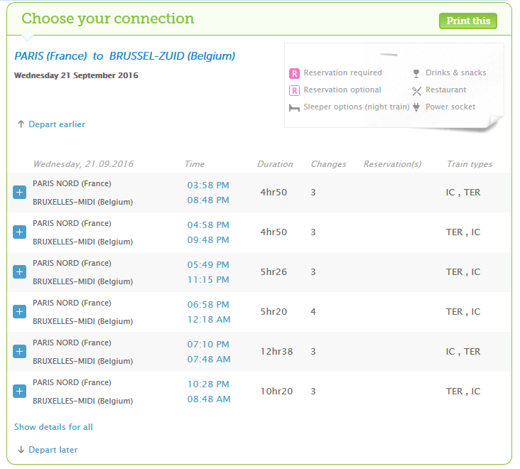 Belirttiğimiz gibi bazı hatlarda rezervasyon yapmanız gerekiyor trenler için. Aslında rezervasyonsuz da gidebiliyorsunuz ama mesela aşağıdaki gibi, Paris-Brüksel arası direk sefer ile 1 saat 20 dakikada gidebilirken, ücret ödemeden binince 3 aktarmalı ve 4.5 saat sürüyor.
