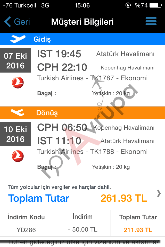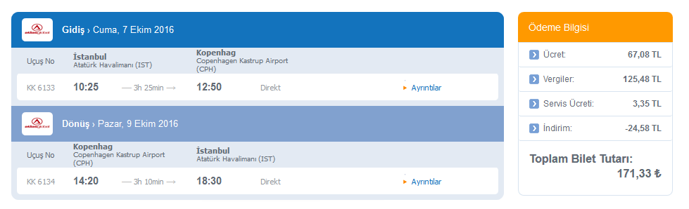 Türk Hava Yolları'nın sunduğu bileti Aerobilet'in mobil uygulamasından alırsanız indirim koduyla beraber fiyat 210 TL oluyor. Aerobilet indirim kodu: YD286Aerobilet İndirim KoduKopenhag'a THY ile Aerobilet'ten Bilet