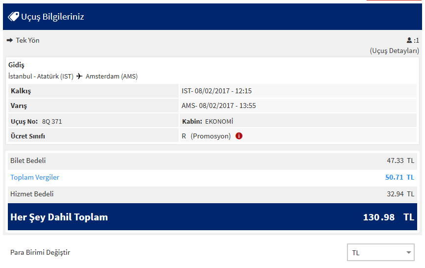 Uçuş paketini (3 adet seçenek var, Sade paket en ucuzu ve ideali) seçip ilerlediğinizde karşınıza tam fiyat çıkacak. Örneğin 8 Şubat 2017'deki bir uçuş için fiyat aşağıdaki gibi çıkıyor.