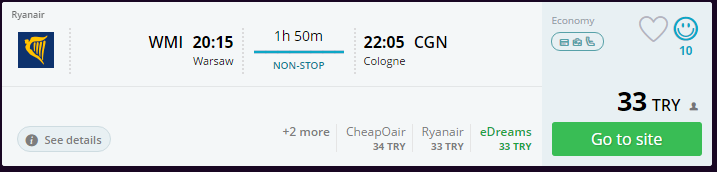Varşova ile Köln arasında da yaklaşık 2 saatlik bir uçuş var ve fiyatı cidden çok komik bir rakam. Bilet Fiyatı: 33 TL