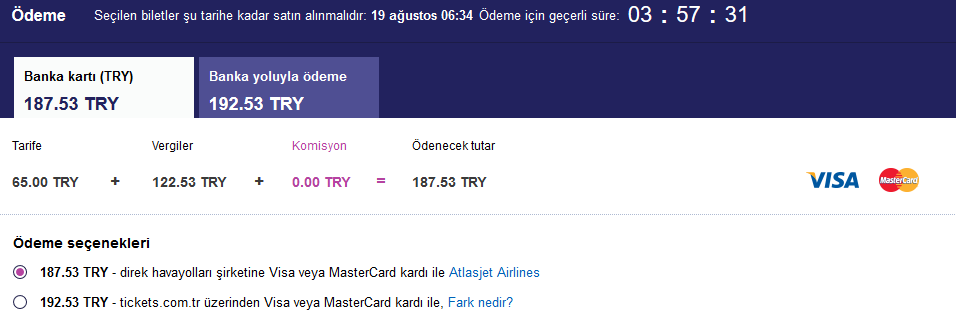 Ödeme sayfasına geldiğinizde aşağıdaki resimde göreceğiniz şekilde 3 farklı ödeme yöntemi ile karşılaşacaksınız. Bu kısımda aklınıza en yatkın olanını seçin, örneğin görseldeki bileti satın alırken direk Atlasglobal'a ödemeyi yaptım. Biletlerin gelmesi biraz daha geç oluyor ama kesinlikle başka hiçbir farkı yok.