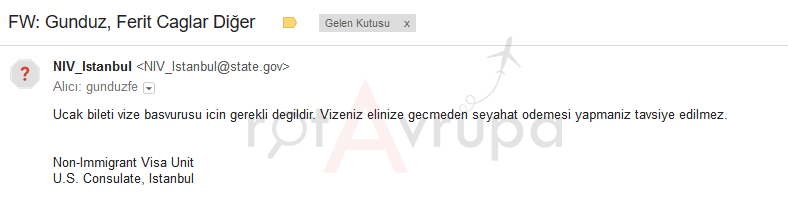 Bununla beraber Mayıs 2016'da Amerika Birleşik Devletleri'ne gitmeyi düşündüğüm zaman net bir bilgi bulamadığımdan kendilerine vize başvurusu yapmadan uçak bileti almalı mıyım? diye sormuştum. Gelen cevap ise aşağıdaki görseldedir. Yani, kısaca: vize almadan uçak bileti için ödeme yapmayın.