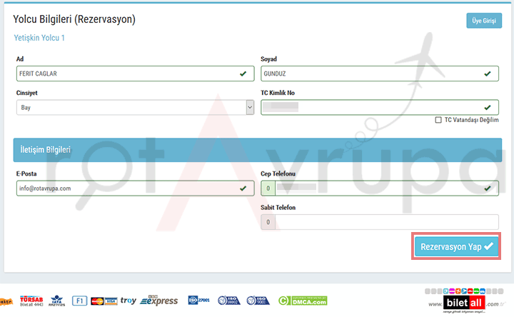 Rezervasyon yap butonuna tıkladıktan sonra sayfanın aşağısında doldurmanız için kişisel bilgiler gelecek. Hepsini doğru bir şekilde doldurun ve sağ altta yer alan Rezervasyon Yap butonuna tıklayın.