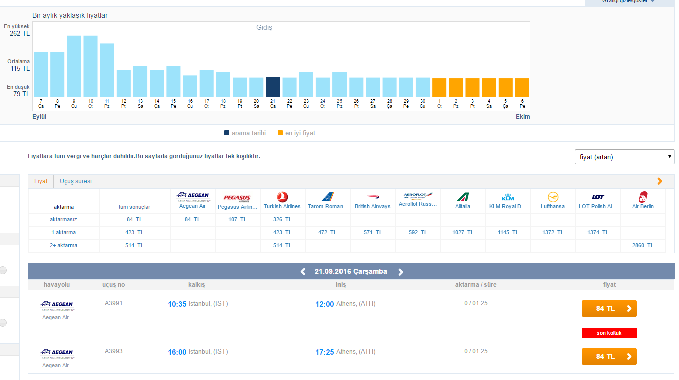 İlk olarak bilet Aerobilet mobil uygulaması üzerinden alınıyor. Bu yüzden IOS ya da Android telefonunuza uygulamasını indirmelisiniz. Daha sonrasında da adım adım, uçuş tarihlerini seçmeli, ilgili uçuşu seçmeli ve ödeme sayfasına gelip indirim kodu olan YD286 kodunu girmelisiniz. İşlem bu kadar! Örnek tarih olarak 21 Eylül 2016'daki uçuşu seçtik. Birçok alternatif de var, önceki ve sonraki günlerde. Ama bu tarihler size uymuyor ise ve başka tarihler isterseniz ne yapmalısınız? Aerobilet'in web sitesine girip, uçuşları seçip arama ekranındaki aylık görünümden size uygun tarihleri seçebilirsiniz.