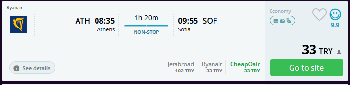 Atina'dan da Sofya'ya geçmek için yine uçak en ucuz yol. Bilet Fiyatı: 33 TL