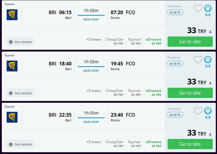 Bari'den de Roma'ya yine ulaşım uçakla. Hatta 3 farklı saat seçeneği var, istediğinizi seçebilirsiniz! Bilet Fiyatı: 33 TL