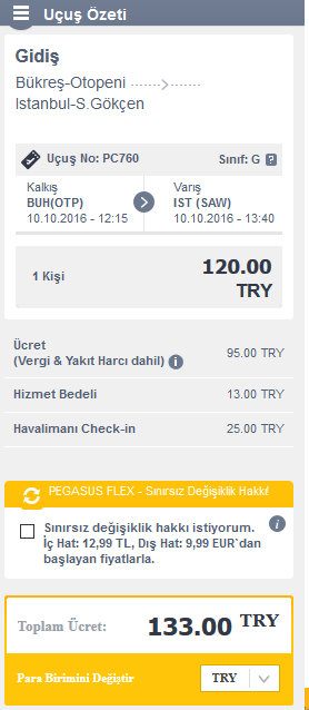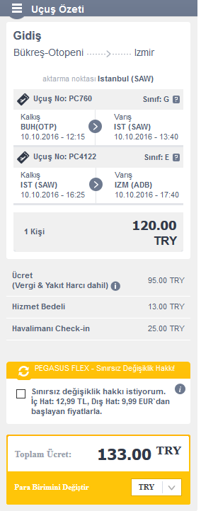 Son olarak da Bükreş'ten İstanbul'a ya da yine aynı fiyatla İzmir'e gidebilirsiniz. Bileti yine Pegasus'un kendi sitesinden almalısınız. Bilet Fiyatı: 133 TL