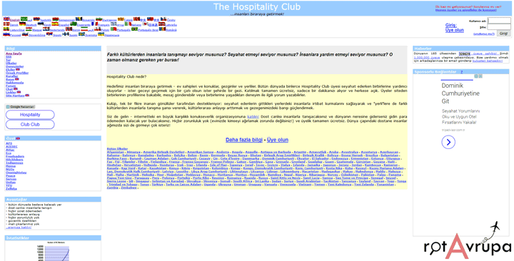 Hospitality Club başkalarının evinde konaklama konusunda kurulan ilk web sitesidir. Evet, Couchsurfing ilk değil :) Çok sade ve basit bir arayüzü var. Ayrıca Türkçe dil desteği de bulunuyor. Tüm dünyada yeterince kullanıcıya sahip olduğu için kendinize göre bir host bulabilir ya da evinize davet edecek insanlar bulabilirsiniz.