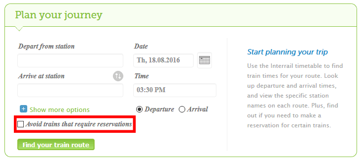 Rezervasyon ücretlerini bulmayı yukarıda gösterdik, rezervasyon gerektirmeyen trenleri ise http://www.interrail.eu/plan-your-trip/interrail-timetable adresinden bulabilirsiniz. Aşağıdaki resimde kırmızı içine alınan kısımdan "rezervasyon gerektiren trenleri gösterme" (Avoid trains that require reservations) kısmına tıklayıp arama yaparak rezervasyon gerektirmeyen, interrail bileti ile binilebilecek trenleri bulabilirsiniz.