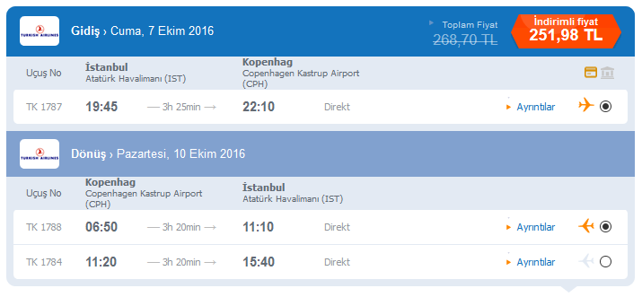 Türk Hava Yolları'nın sunduğu bileti Aerobilet'in mobil uygulamasından alırsanız indirim koduyla beraber fiyat 210 TL oluyor. Aerobilet indirim kodu: YD286Aerobilet İndirim KoduKopenhag'a THY ile Aerobilet'ten Bilet