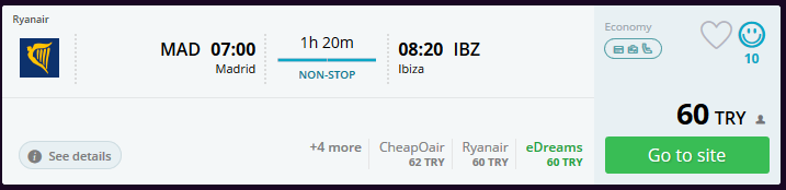 Ryanair'in uçuş fırsatı ile Ibiza'ya ucuza gidebilirsiniz. Bilet Fiyatı: 60 TLMadrid ibiza uçak bileti