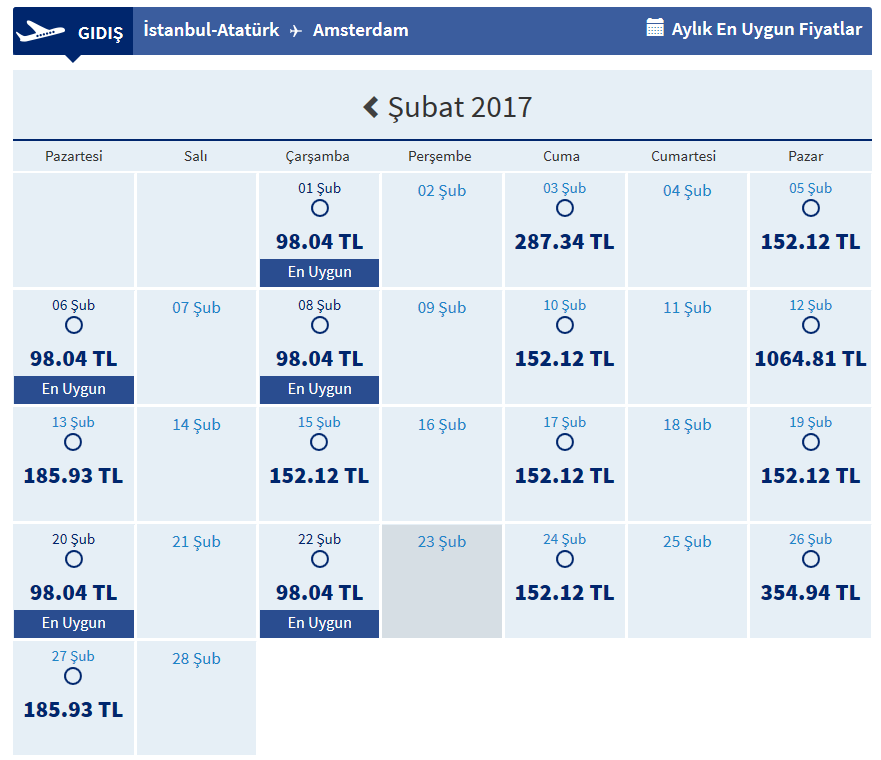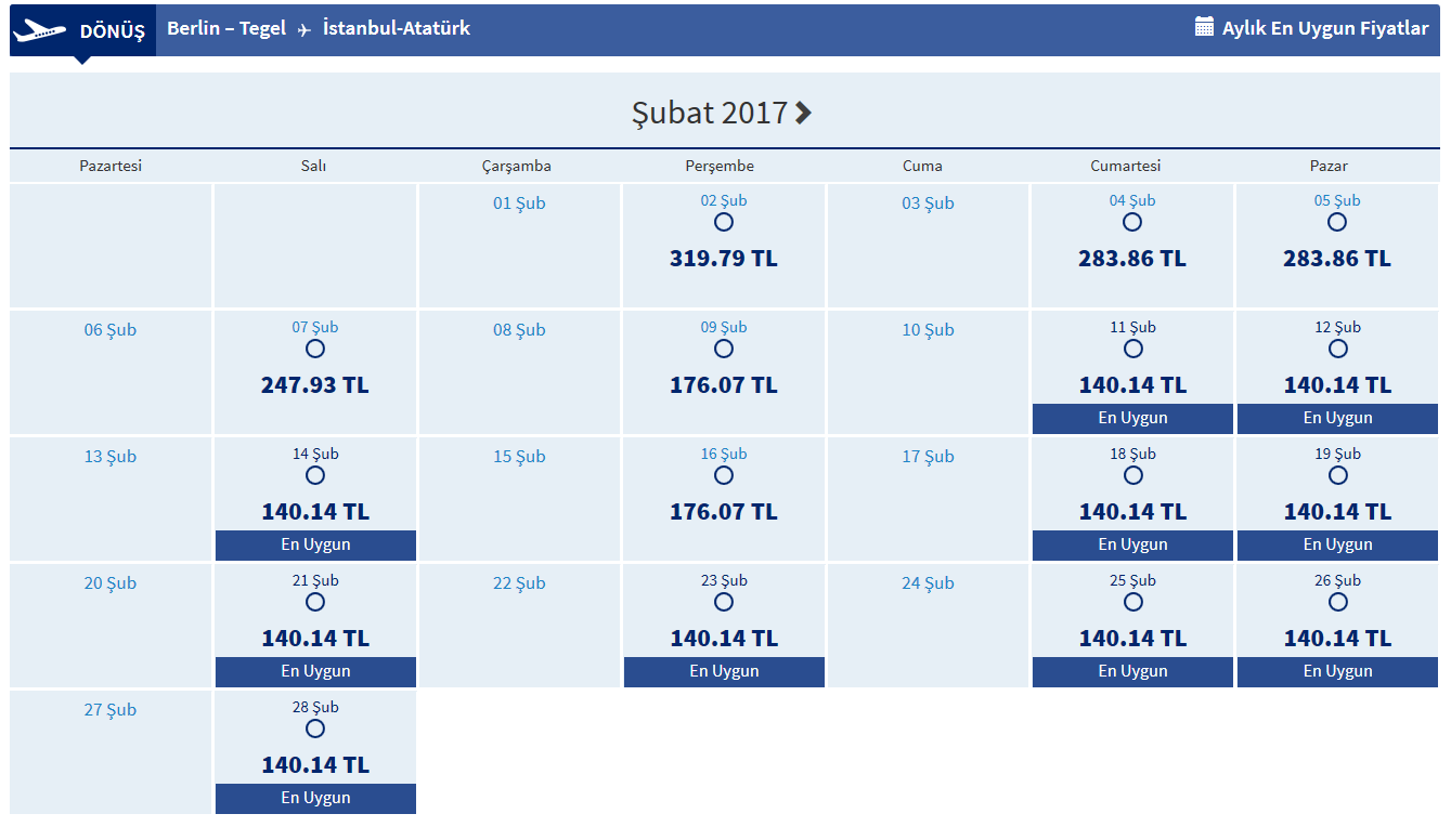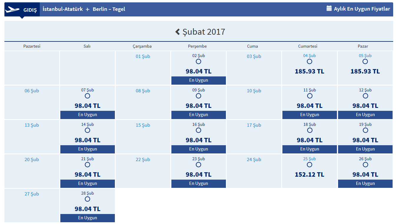 Karşınıza seçtiğiniz ay içideki uçuşların fiyatları aşağıdaki gibi gözükecek. Ama bu fiyatlar sizi yanıltmasın.