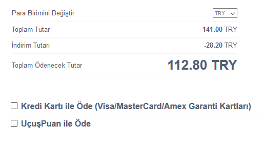 İndirimin düşmesi ödeme sayfasına geldiğinizde Seçili Avrupa Hatları %20 İndirim seçeneğini seçmeniz dahilinde gerçekleşecektir.