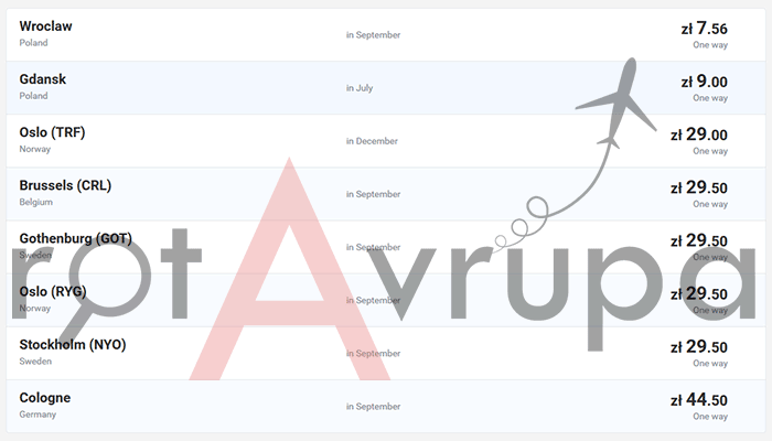 Aşağıdaki görselden de göreceğiniz üzere Varşova'dan çok ucuza Oslo, Brüksel, Götenburg, Stokholm ve Köln'e gidbilirsiniz. Şu anki kur, 1 PLN=0.72 TL. Yani, 21 TL'ye osloya, 7 TL'ye Gdansk'a, 33 TL'ye de Köln'e geçebilirsiniz. Aşağıdaki bağlantıda Varşova-Gdansk arasında 7 TL'ye uçak bileti alabilirsiniz. Hem de Eylül ayına!
