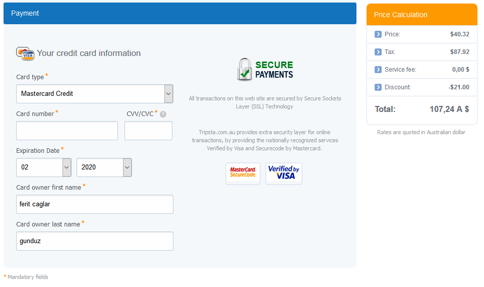 Mastercard ile öderseniz ücret alınmıyorVisa kredi kartı ile öderseniz 22 AUD ücret alıyor.Diğer örnek tarihler: