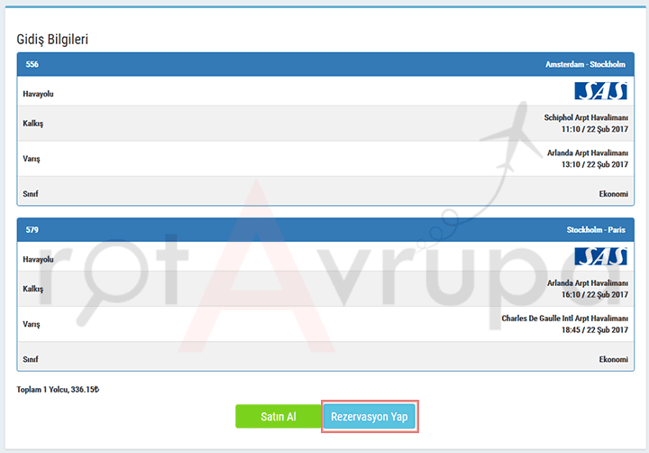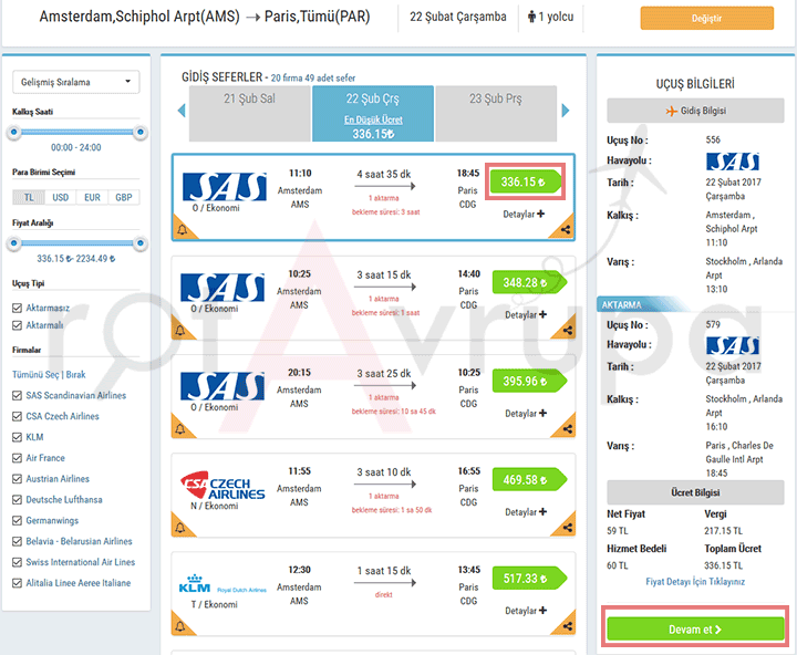 Vize için ücretsiz uçak rezervasyonu yapacağımız bu örnek anlatımda 22 Şubat 2017 tarihi için, Amsterdam-Paris uçuşu için bir rezervasyon yapacağız. Ve bu yaptığımız rezervasyonu vize başvurusu evrakları arasına koyacağız.